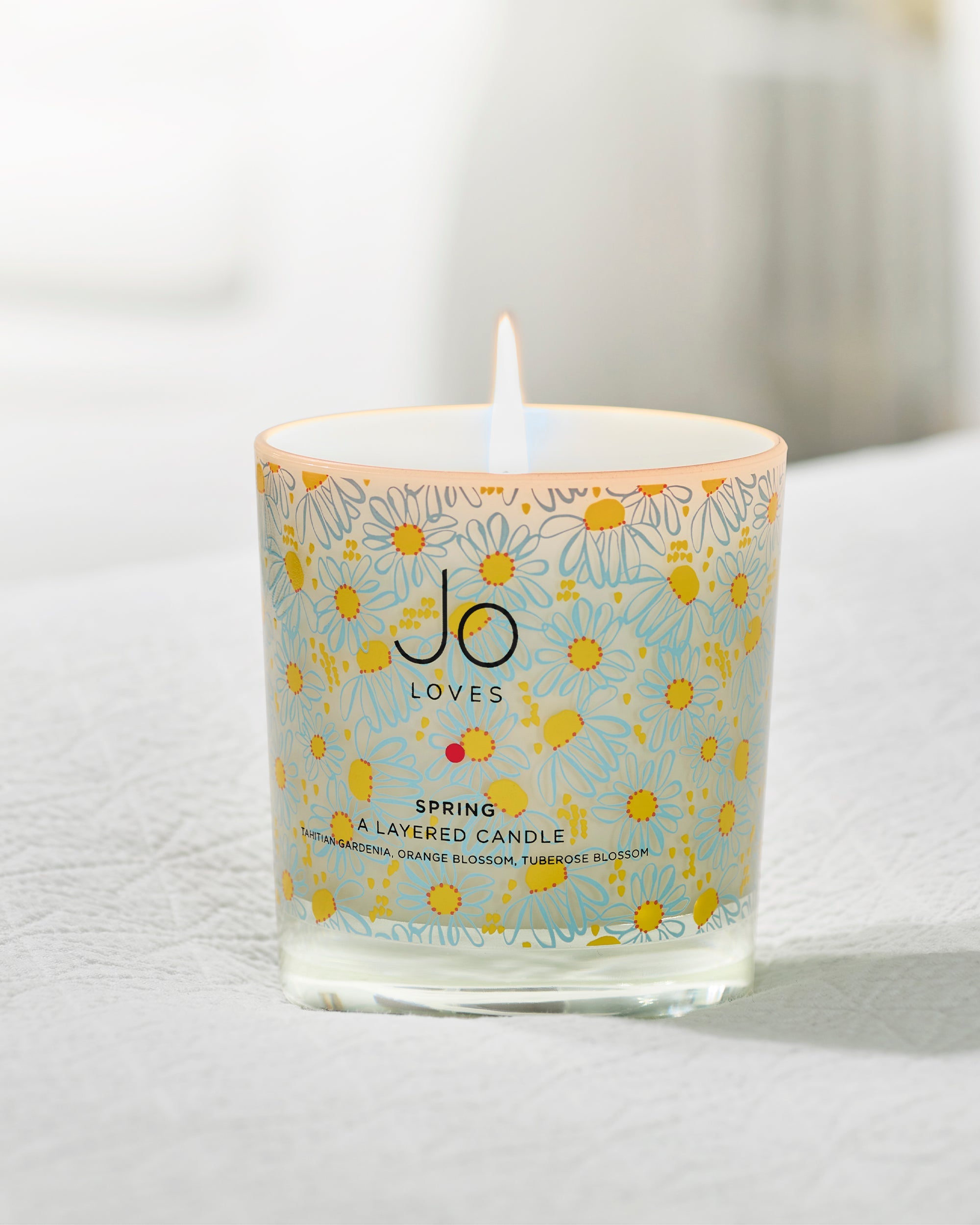 Housed in an artisan crafted handblown glass, adorned with a delicate floral design, the packaging brings Jo’s vision of spring to life. Hand-poured in England, this beautifully composed piece distils the essence of springtime, into one luminescent centrepiece.