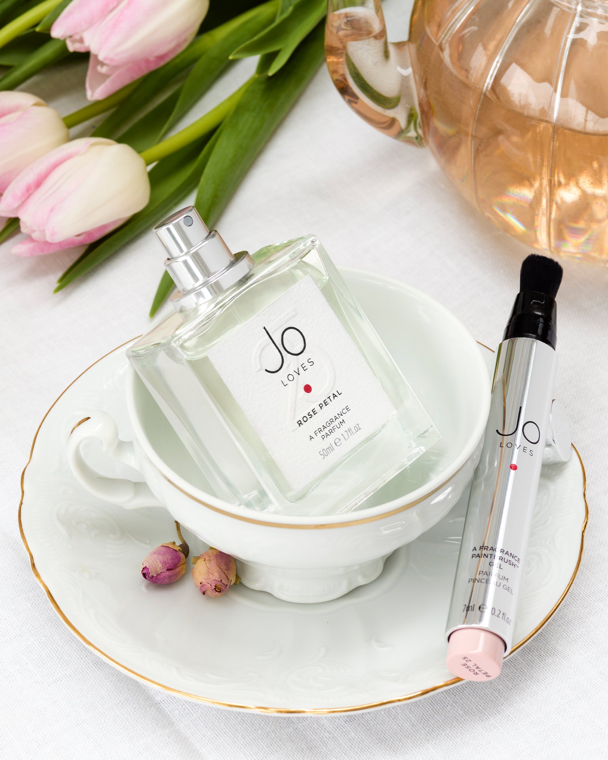 Experience the innovative Fragrance Paintbrush™, featuring a Rose Petal 25 gel formula that holds the fragrance and dries in seconds, with a design that prioritizes re-usability. Celebrate Jo's 25-year journey through beauty and fragrance, from the roses in her family's garden to the Rose De Mai harvest in Grasse, with scent notes of Bergamot, Saffron, Lychee, Rose Water, Turkish Rose, Bulgarian Rose, Rose De Mai Absolute, Rose Absolute, and Ambrette Seed.